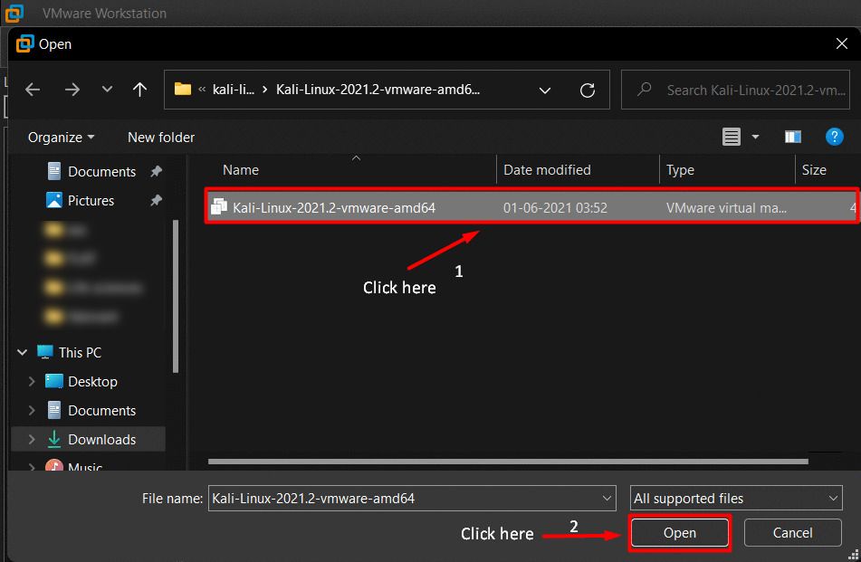 And you get a pop-up window, Now open the extracted VMware image folder, select the Kali Linux Image (.vmx) file, and click on open.