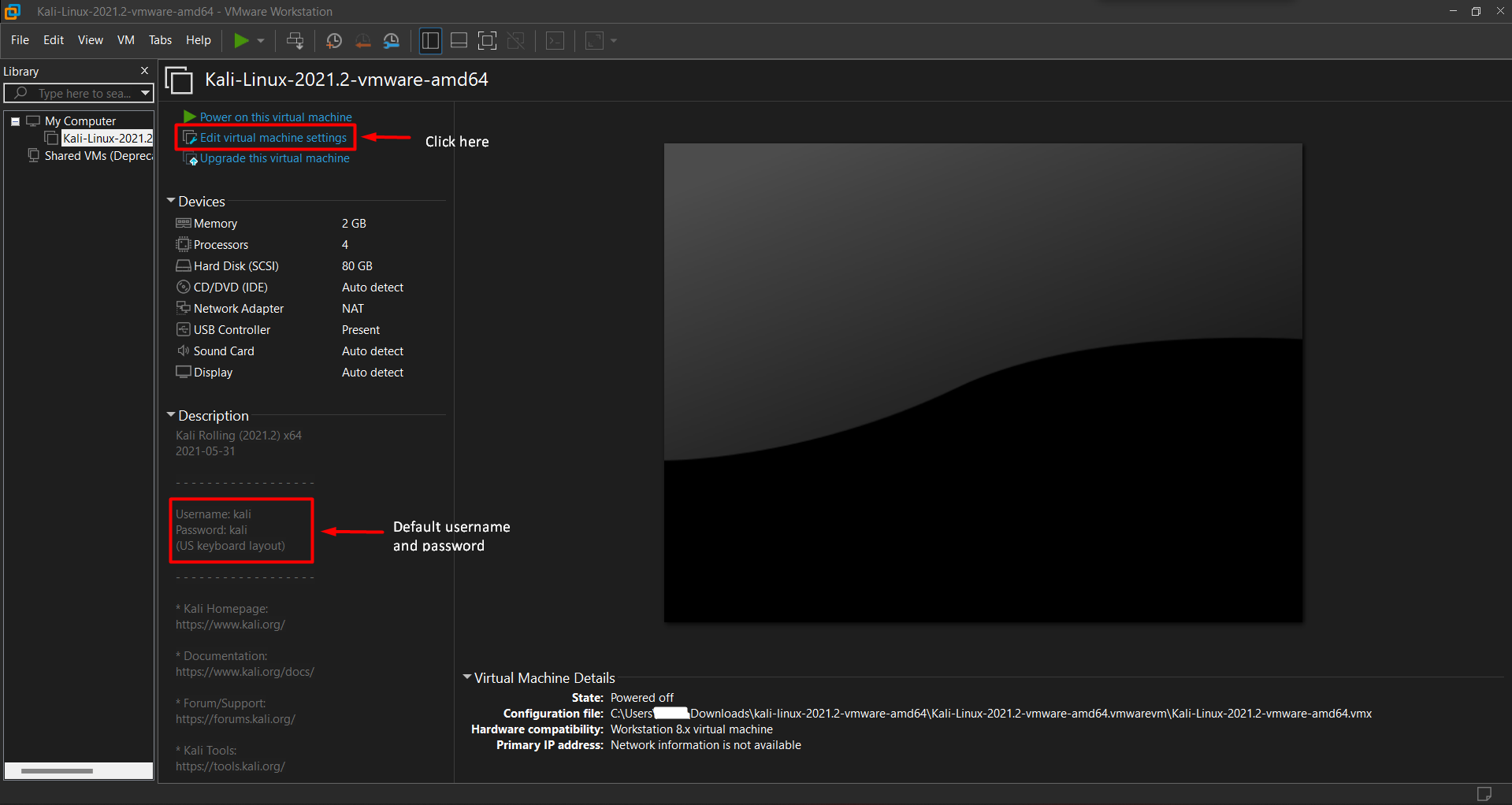 To edit the Kali Linux configurations, click on "Edit Virtual machine settings".
