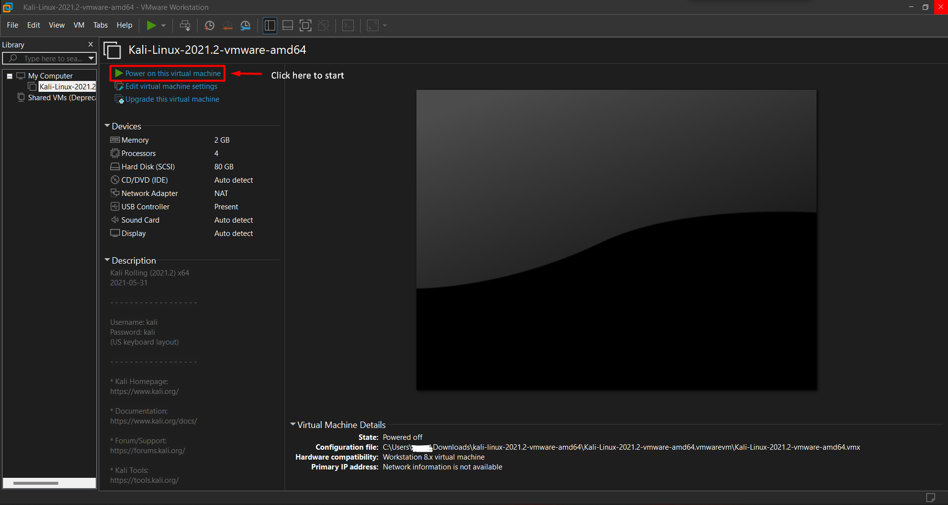 To start the Kali Linux, click on "Power on the Virtual Machine".