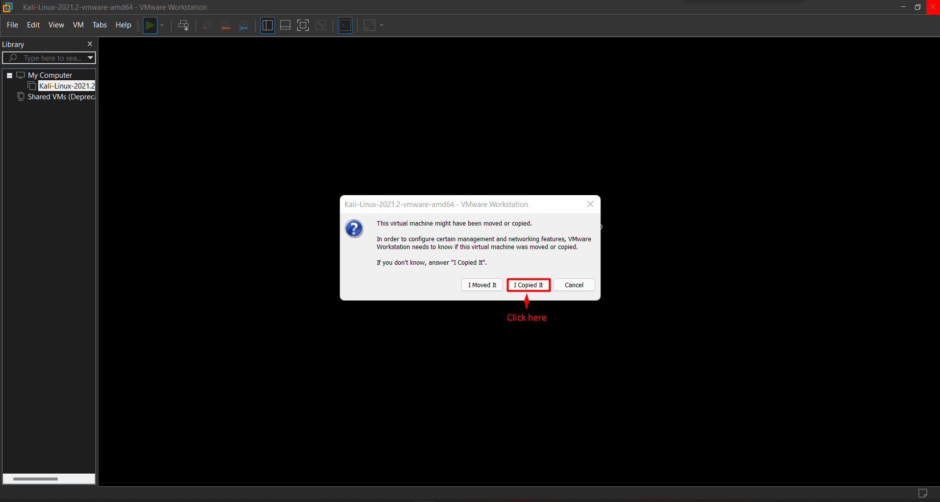 When you power on your Kali Linux for the first time, this pop-up will appear. Then click on "I Copied It".